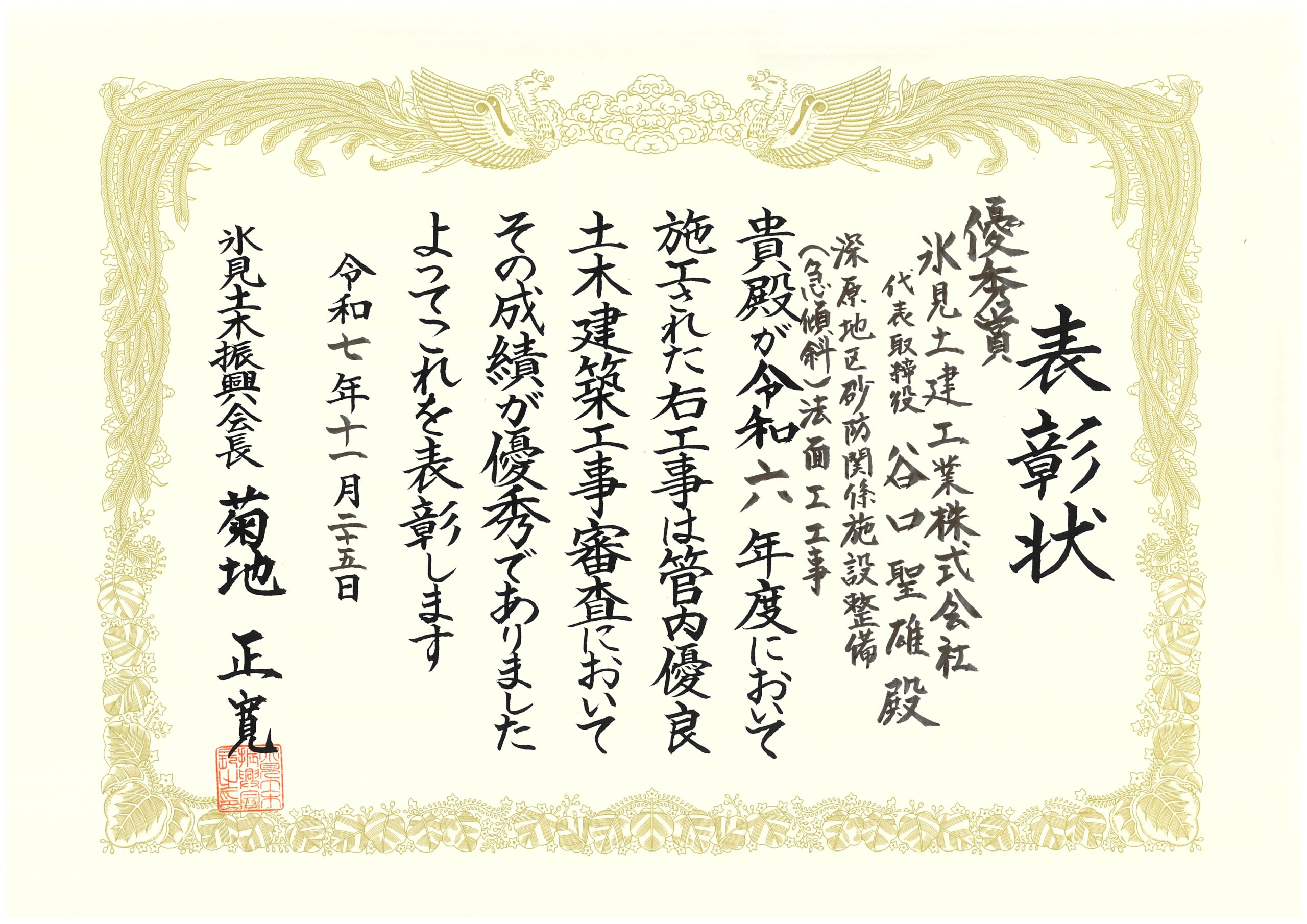 ご案内 令和7年度氷見土木事務所管内優良土木建築工事表彰 2025.12.01 令和7年度 氷見土木事務所管内優良工事「優秀賞」を頂きました。 工 事 名:深原地区砂防関係施設整備(急傾斜)法面工工事 工事場所:氷見市 深原 地内